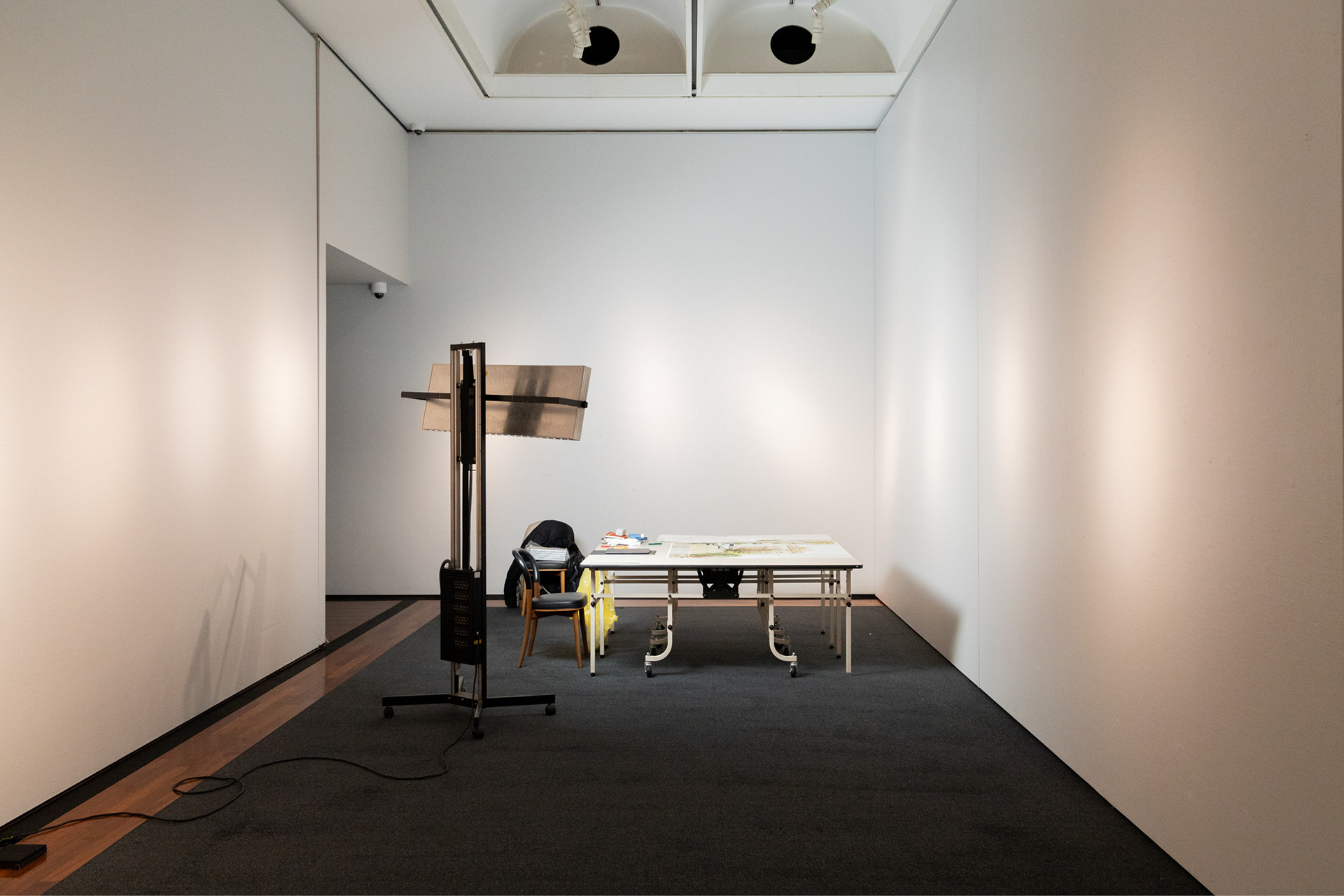 作品を完成させるため、展示スペース内で直接作業する機会を得た。ドイツで制作した自身のプリントを切り取り、組み立て、パズルのような構成を微調整し、作品設営を行った。テーブルと照明が設置されたスペースで、リアルタイムで作品を一つにまとめていく過程は、まさに作品そのものの延長のように感じる。